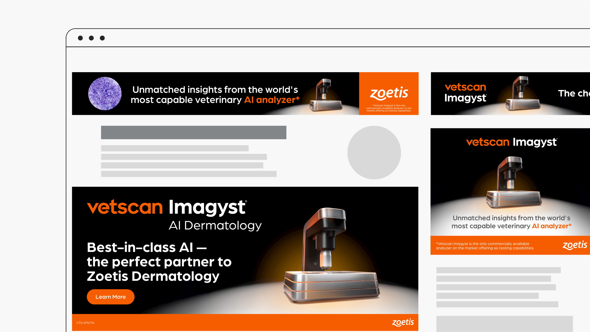 ‘Dark mode’ creative evoked tech advertising for a visual identity that communicates power and forward thinking, while the Zoetis orange tied it to the strength and history of the parent brand. Using light and shadow, we presented Vetscan Imagyst as the market hero.